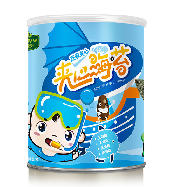 好娃娃夾心海苔系列有桶裝、袋裝兩個包裝,采用的是進口無污染,自然生成且生長周期合適的條斑紫菜