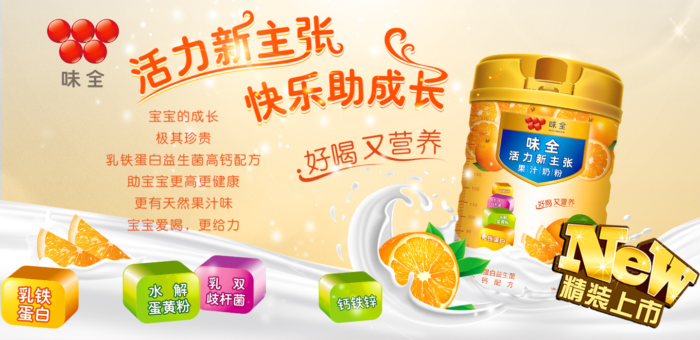 味全活力新主張果汁奶粉,甄選優(yōu)質(zhì)奶源,采用先進(jìn)工藝制作。乳鐵蛋白,天生抵御力;水解蛋黃粉30mg/100克,鈣1000mg/100克,并富含鐵、鋅,開創(chuàng)成長新高度;DHA+AA+牛磺酸,開啟思維動(dòng)力,暢享智慧未來;乳雙岐桿菌,營養(yǎng)好吸收;橙汁8%,好口味,喜歡喝,早晚一杯,讓孩子成長營養(yǎng)均衡。