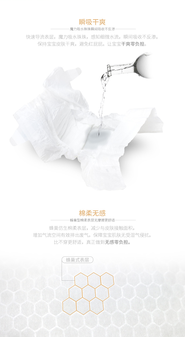無(wú)紡布面料:精選極致柔軟穿孔無(wú)紡布面料,清爽透氣,質(zhì)地輕柔,有效吸收尿液和稀便,給寶寶zui大限度的柔軟體驗(yàn)。